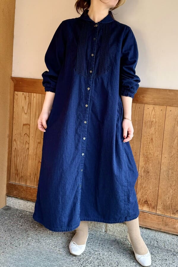 インディゴのガーゼ素材を使用し、キレイ目なピンタックワンピースをお作りいたしました。