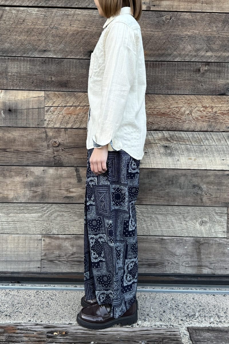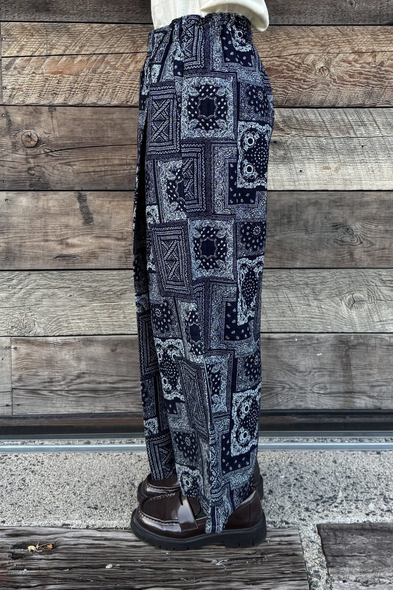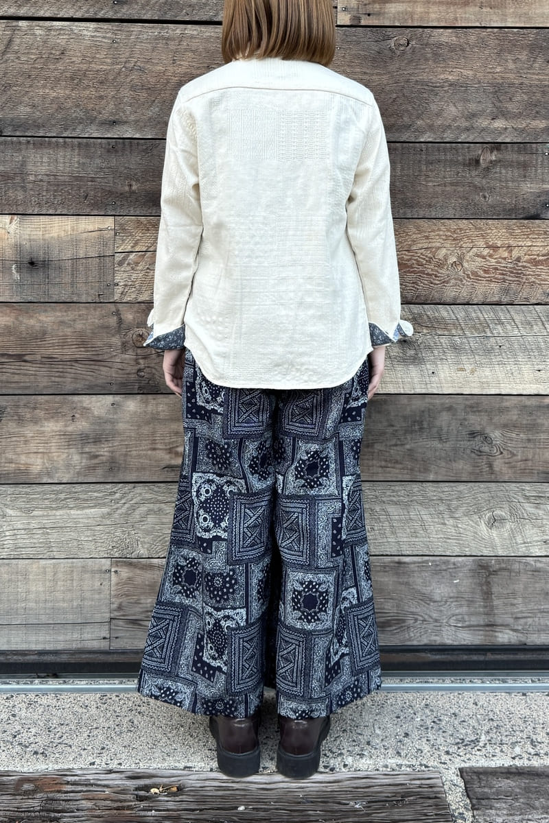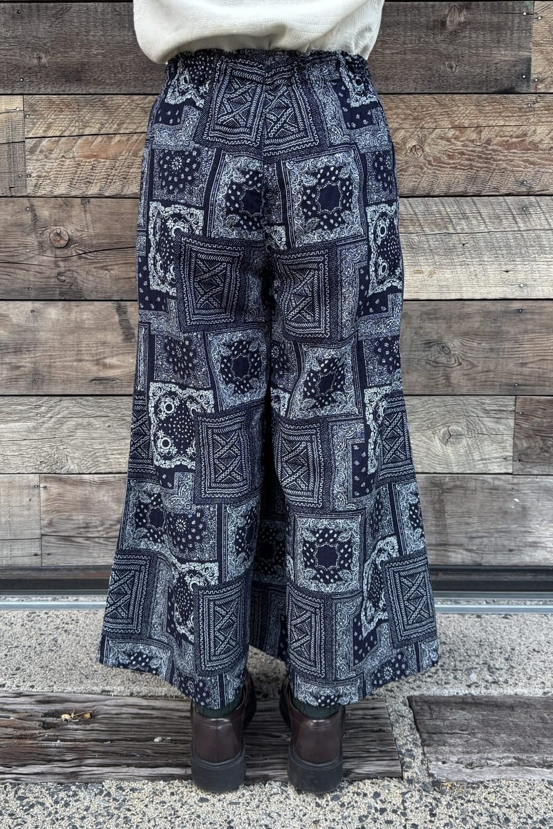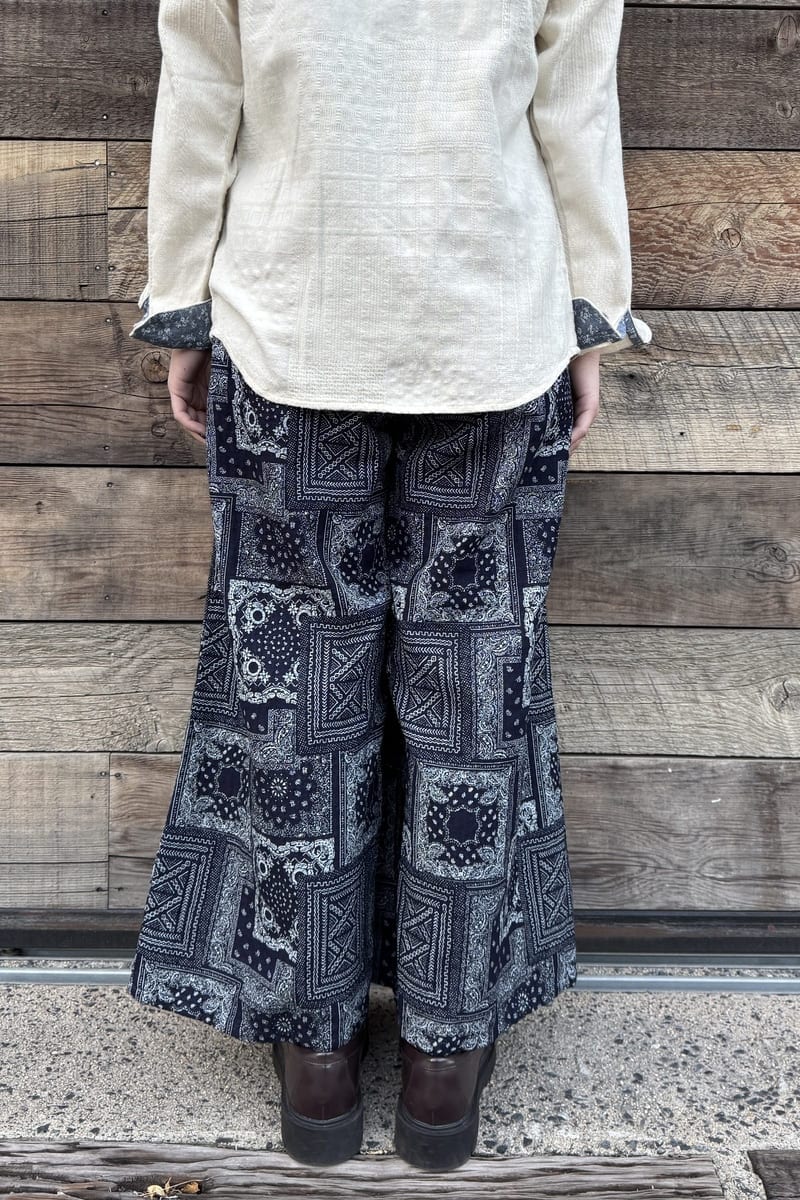 バンダナ柄をインディゴの二重織で表現した素材で、カフェパンツをお作りしました。