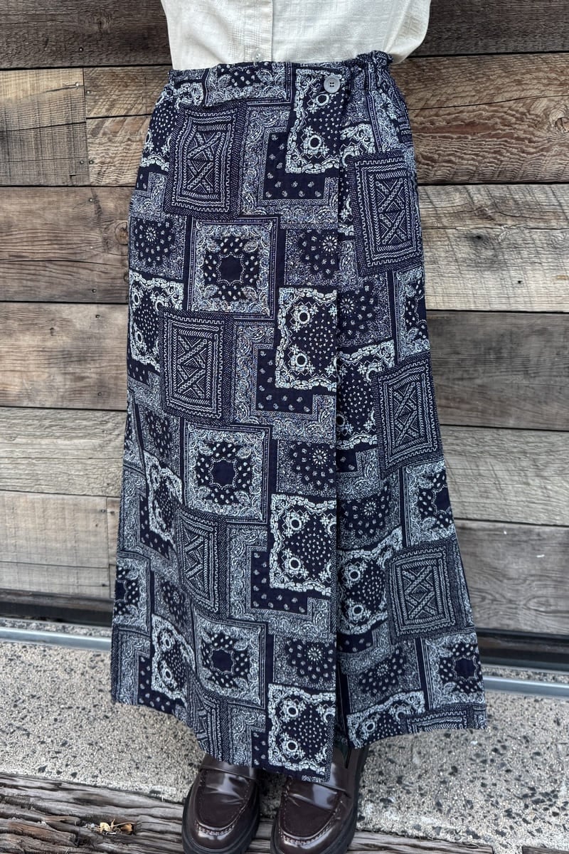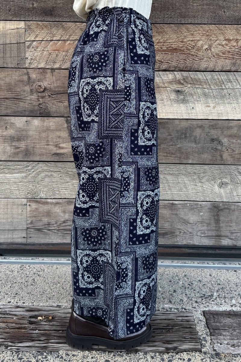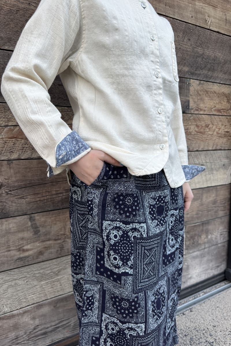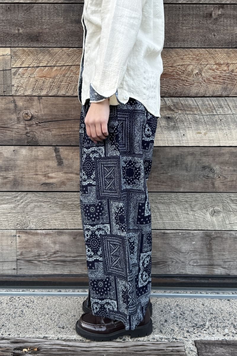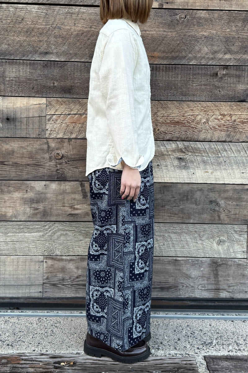 バンダナ柄をインディゴの二重織で表現した素材で、カフェパンツをお作りしました。