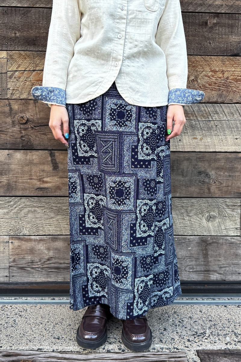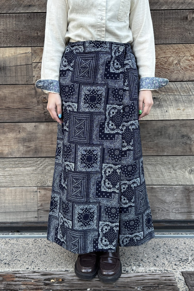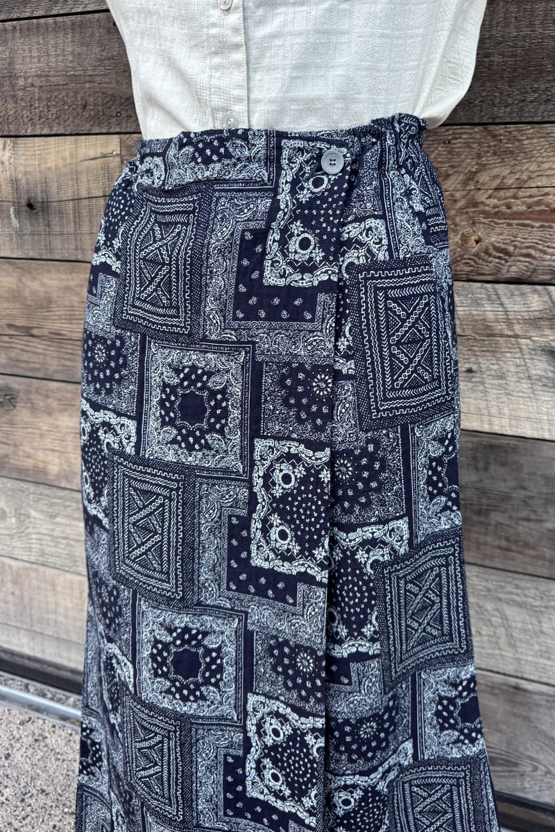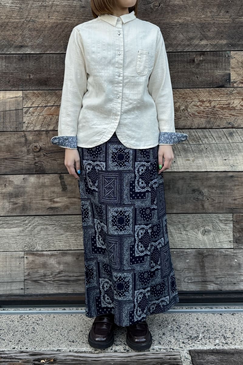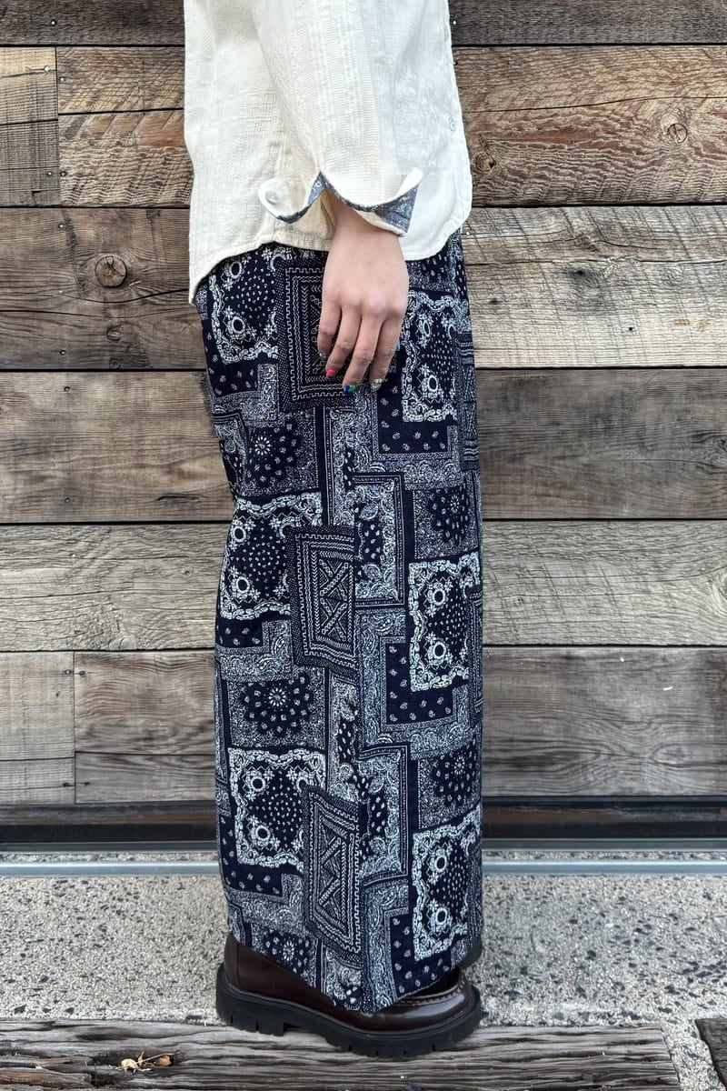 バンダナ柄をインディゴの二重織で表現した素材で、カフェパンツをお作りしました。