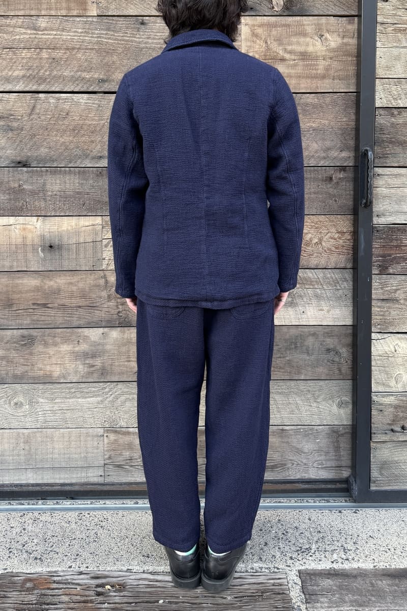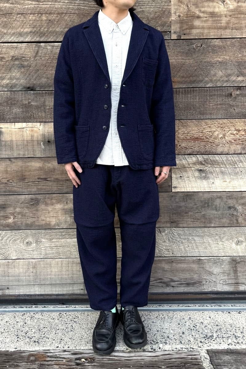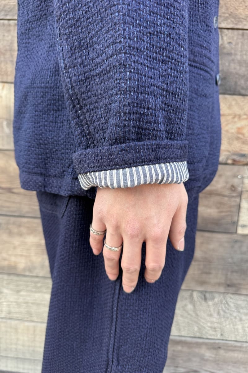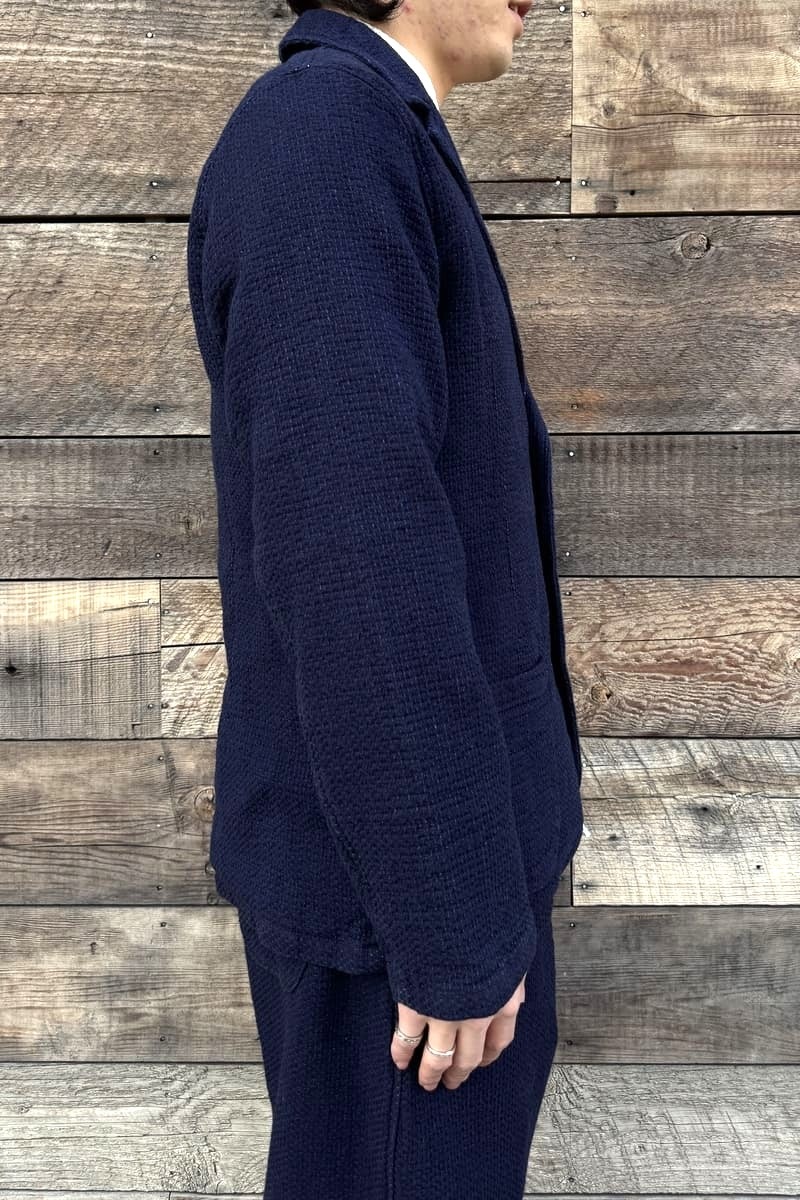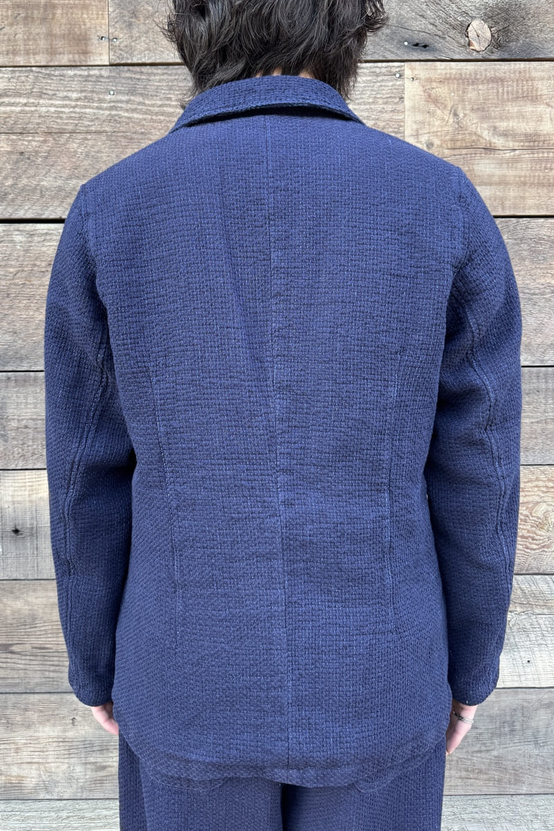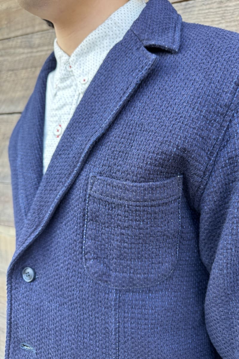 経糸にインディゴ、緯糸にキナリの糸を使用した立体感のある刺し子織りのBlueTrickオリジナル素材でテーラージャケットをお作りいたしました。