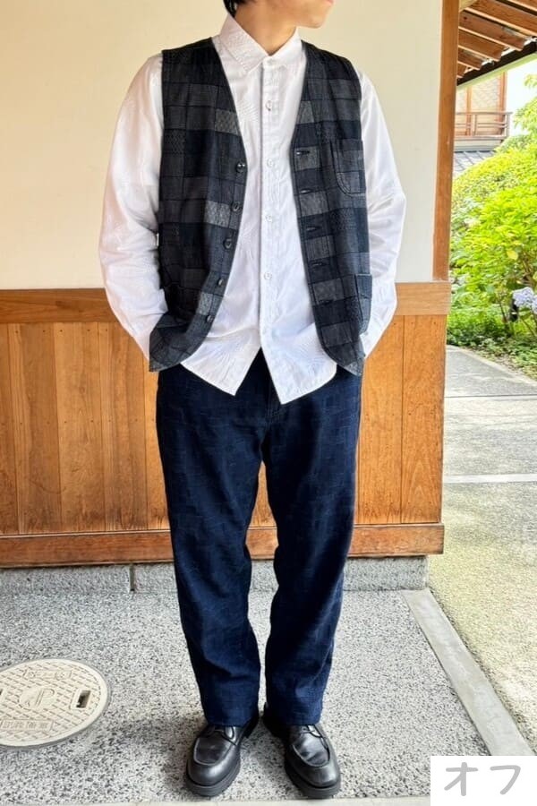 お色は、横糸にオフの糸を織り込んだ 織り模様がはっきりとした「オフ」と、横糸にフェード(薄いインディゴ)糸を織り込んだ 落ち着いた雰囲気の「フェード」の2色展開。 着るほどの経年変化もお楽しみいただけます。