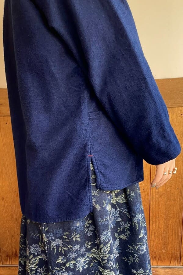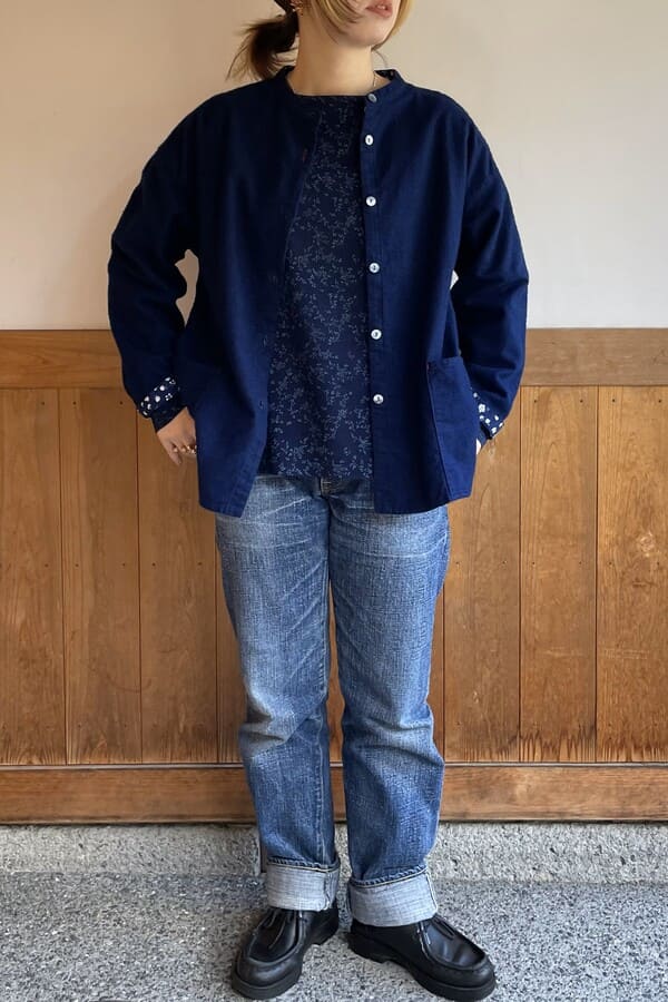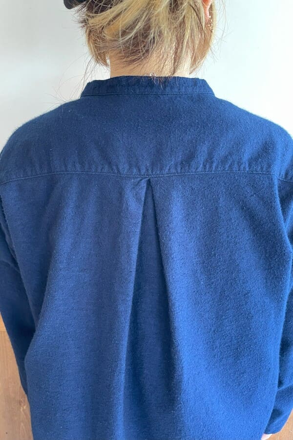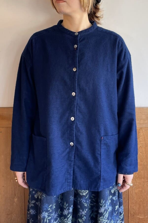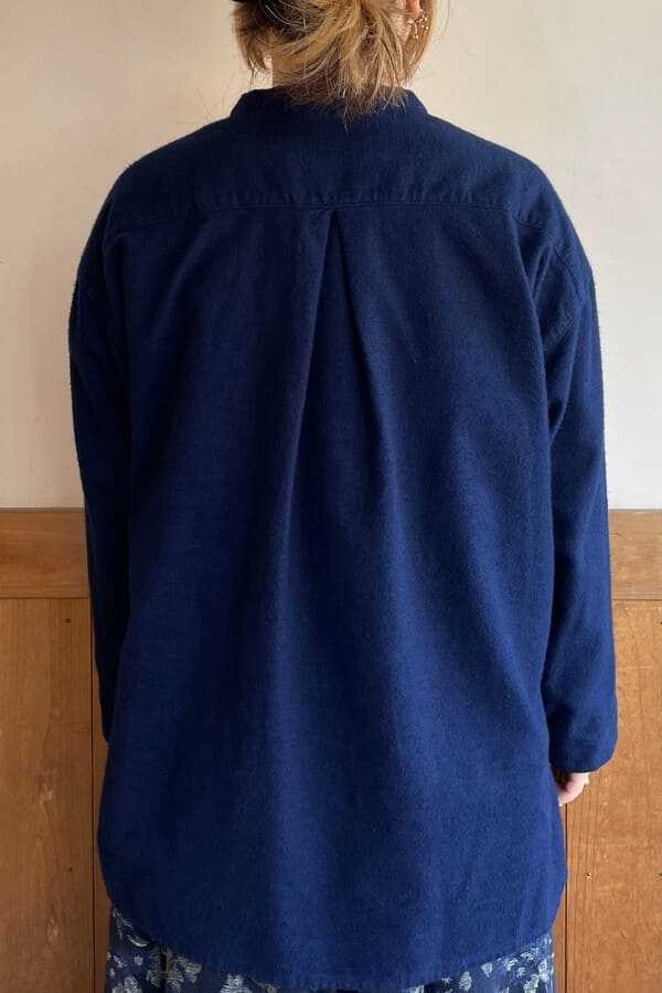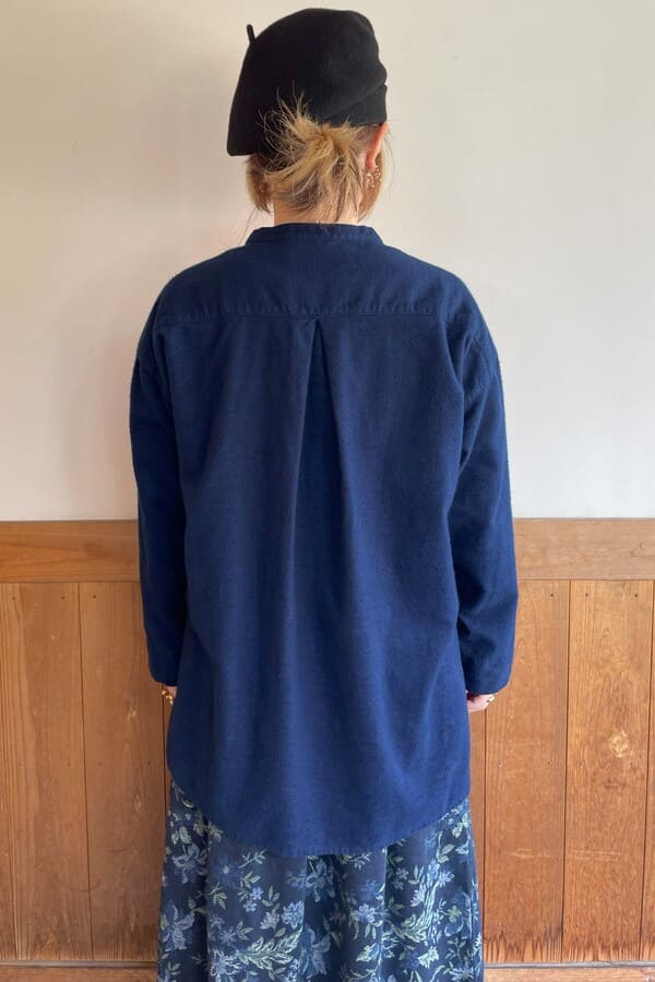 インディゴのネル素材でバンドカラーブラウスをお作りいたしました。