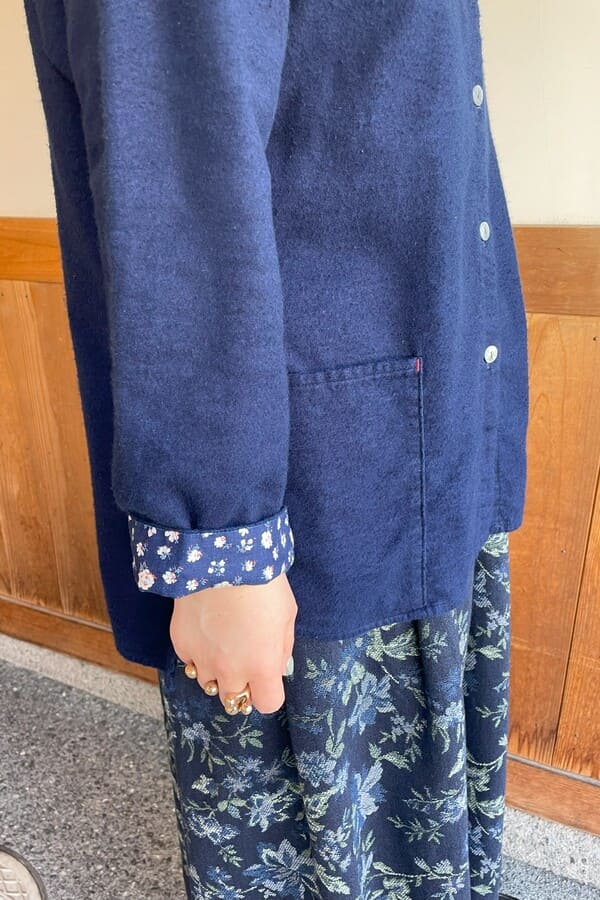 一見シンプルですが、可愛いシェル調釦と実用的な前ポケット、脇のアシンメトリーなスリット、インディゴに映える赤のカン止めがポイント。配色の小花使いも可愛い。