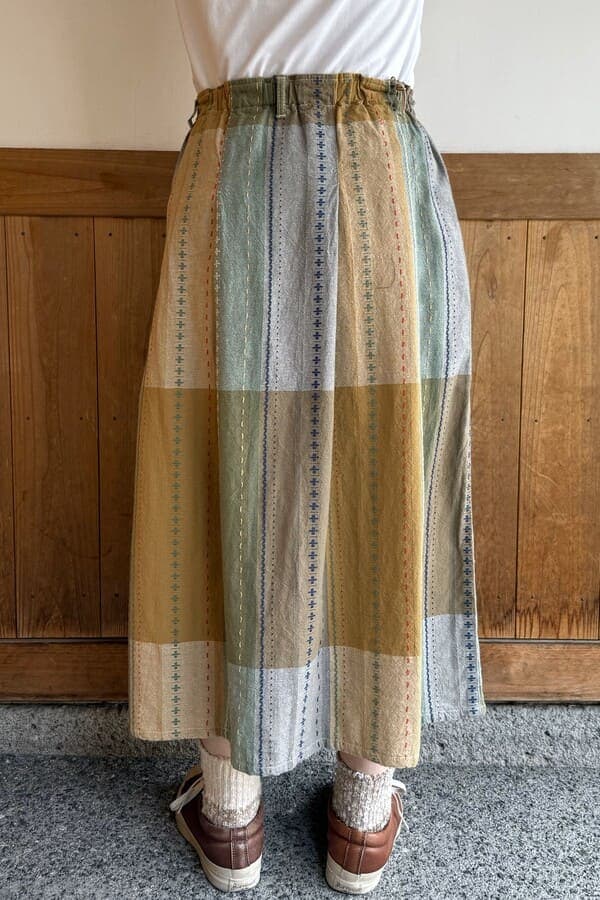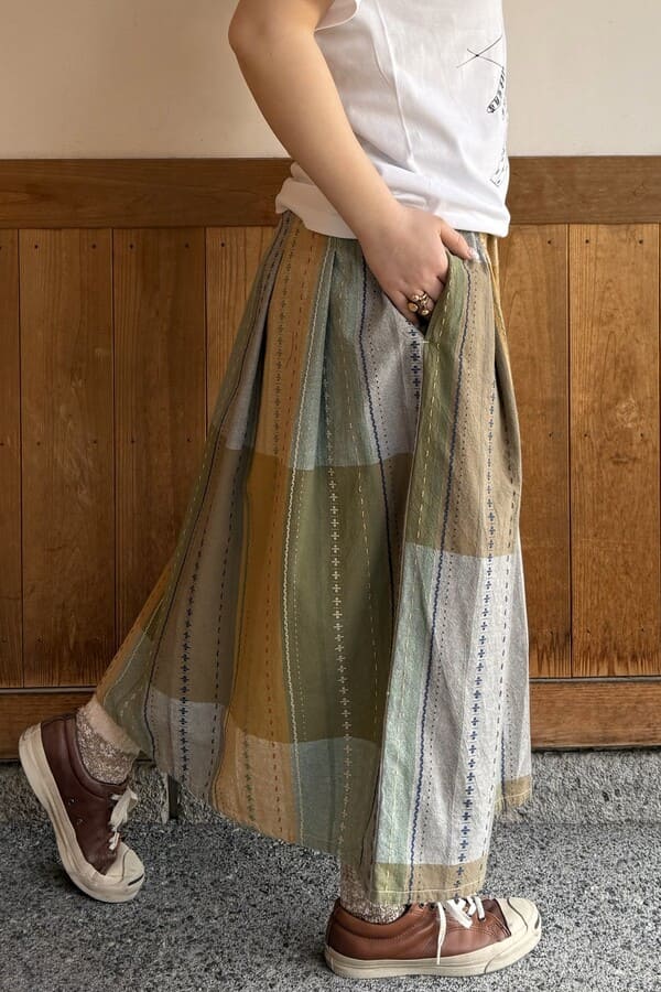 明るいナチュラルカラーを組み合わせたBlueTrickオリジナルパネル生地で、タックスカートをお作りしました。