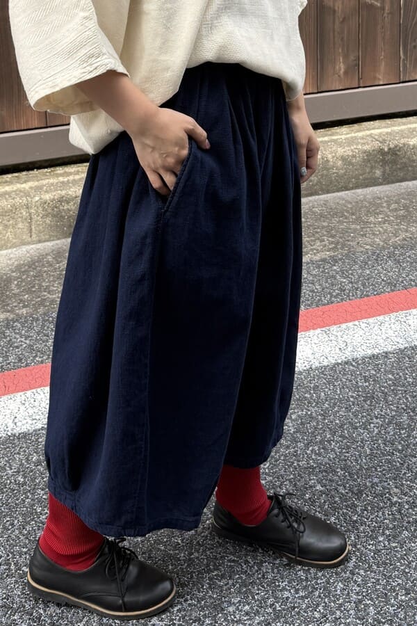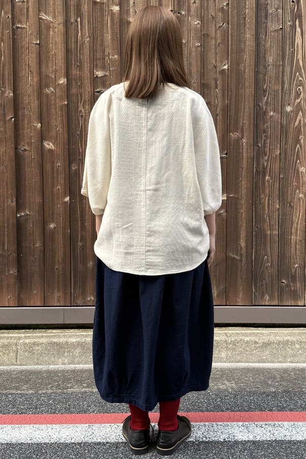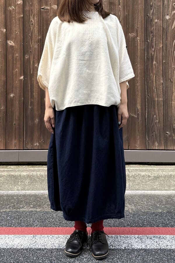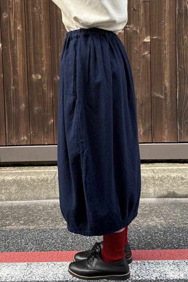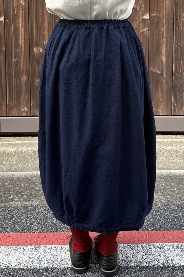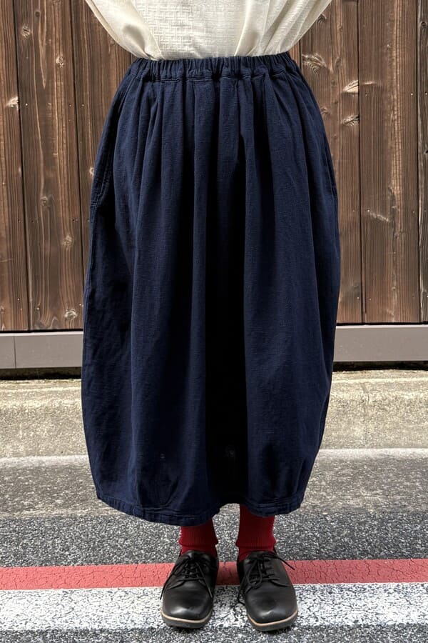 ロープ染色したインディゴ糸で織りあげたデニムを使用し コクーンスカートをお作りしました。