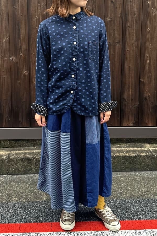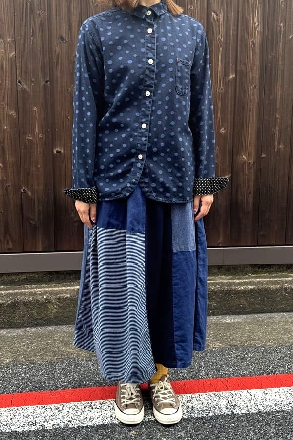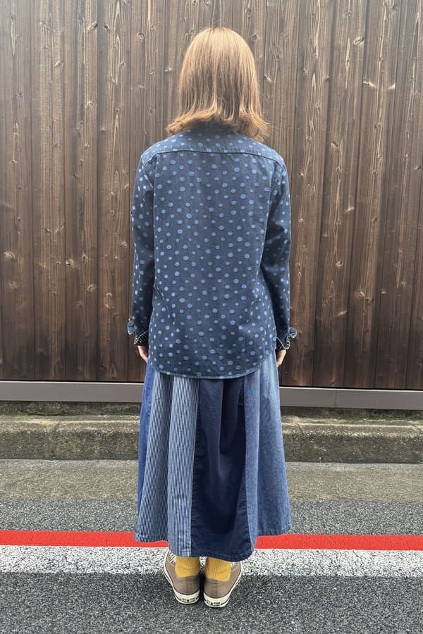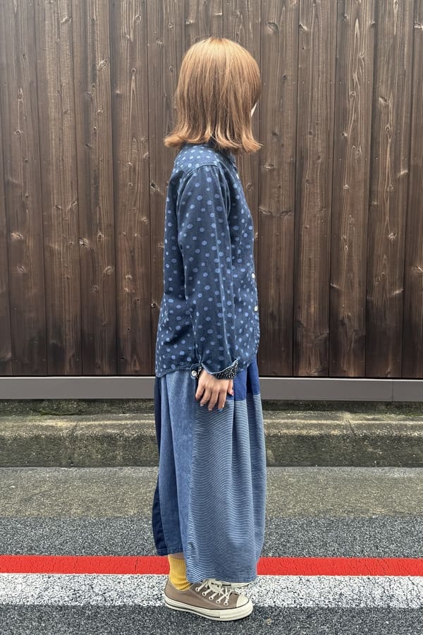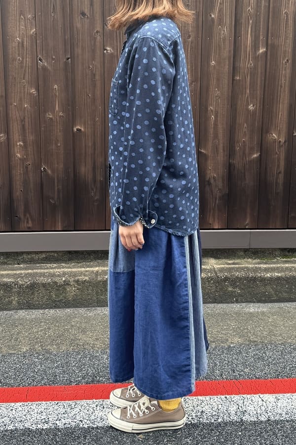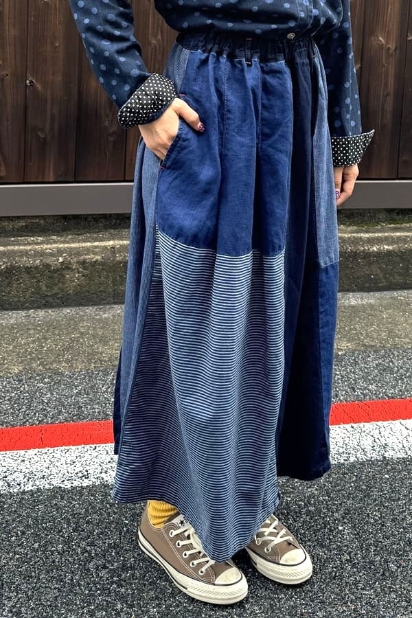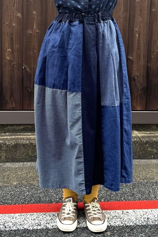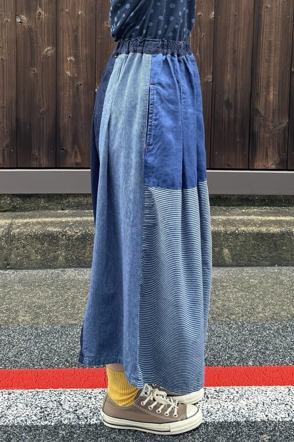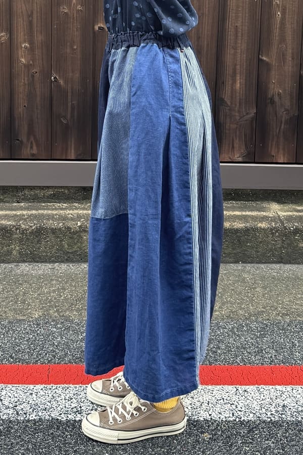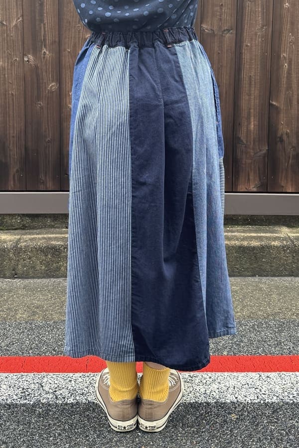 4種の異なるインディゴ素材を使用した落ち着いた雰囲気の切り替えスカートをお作りしました。