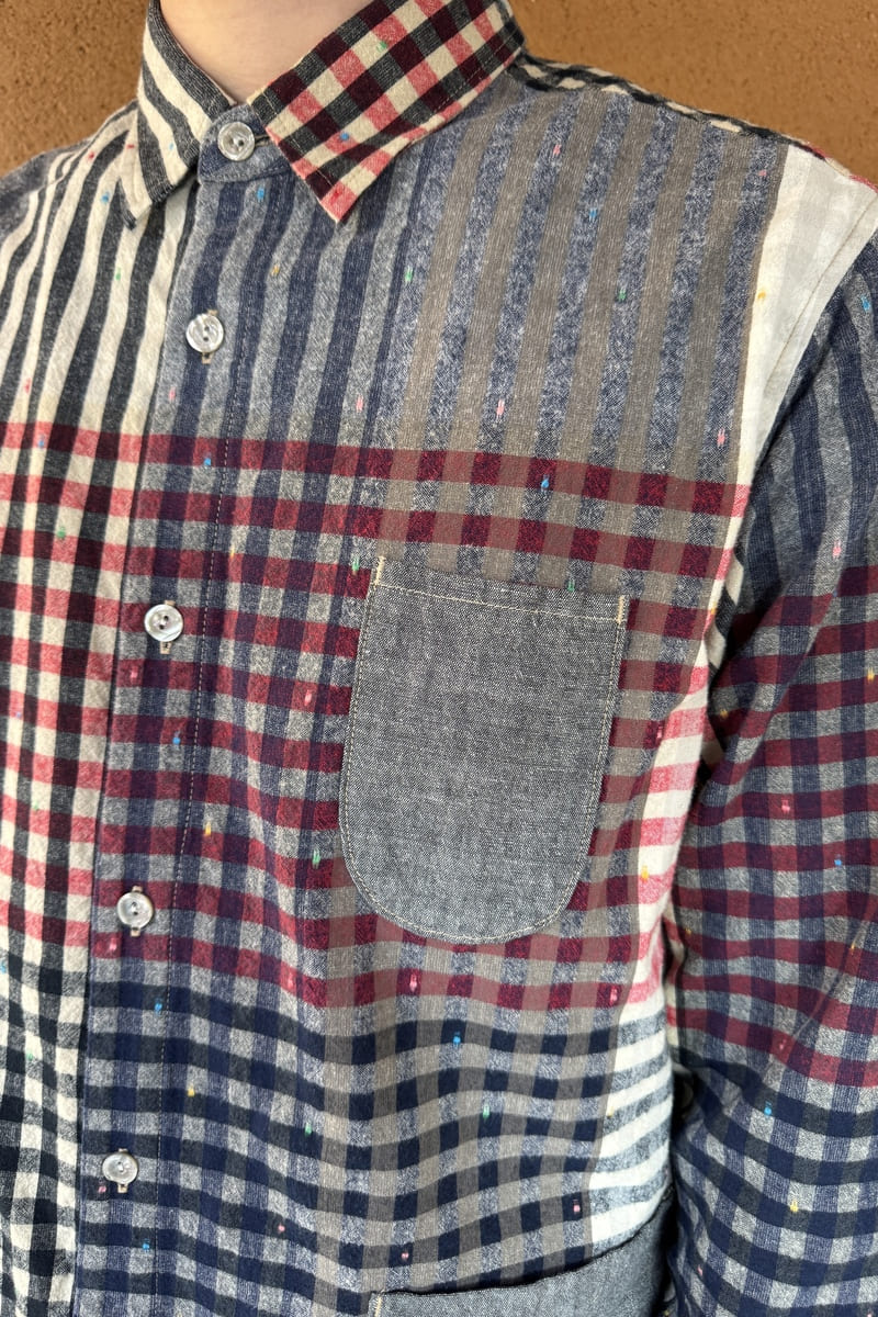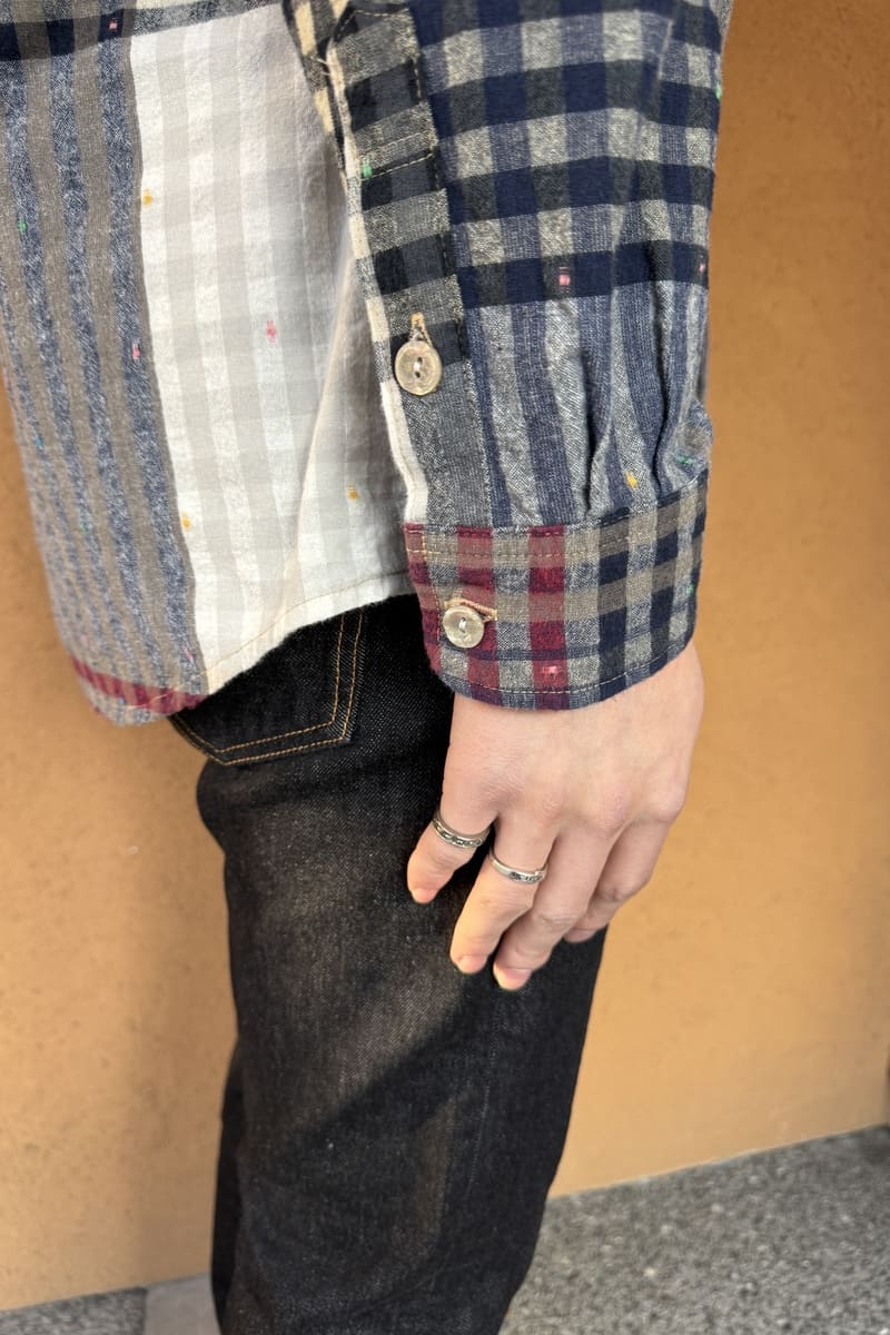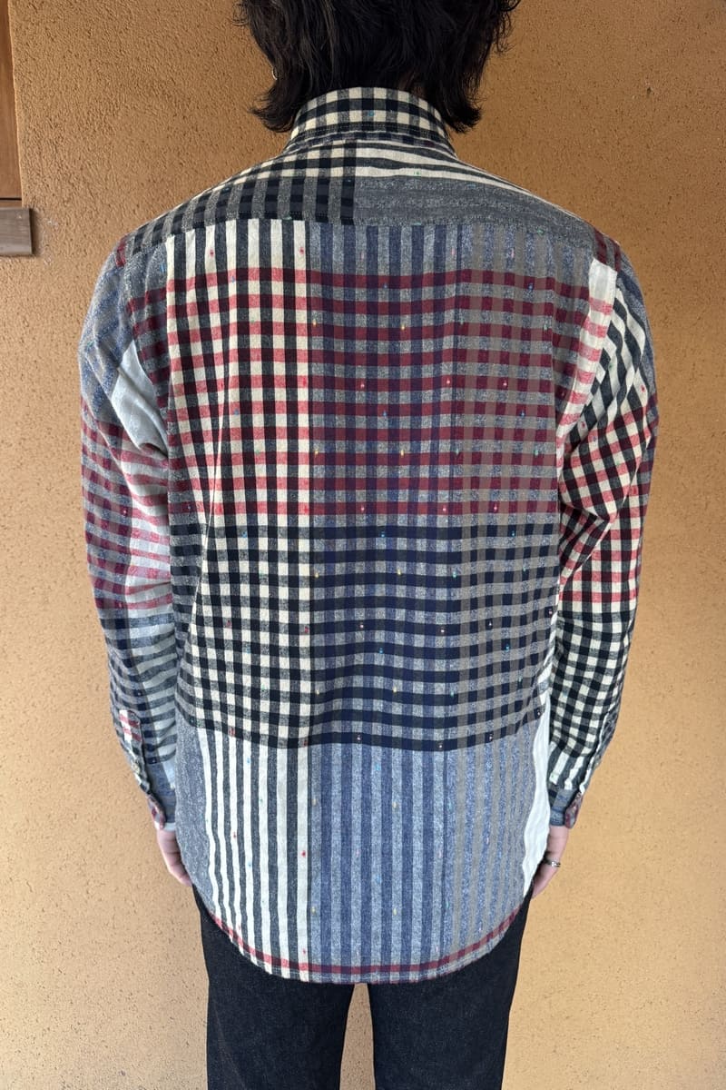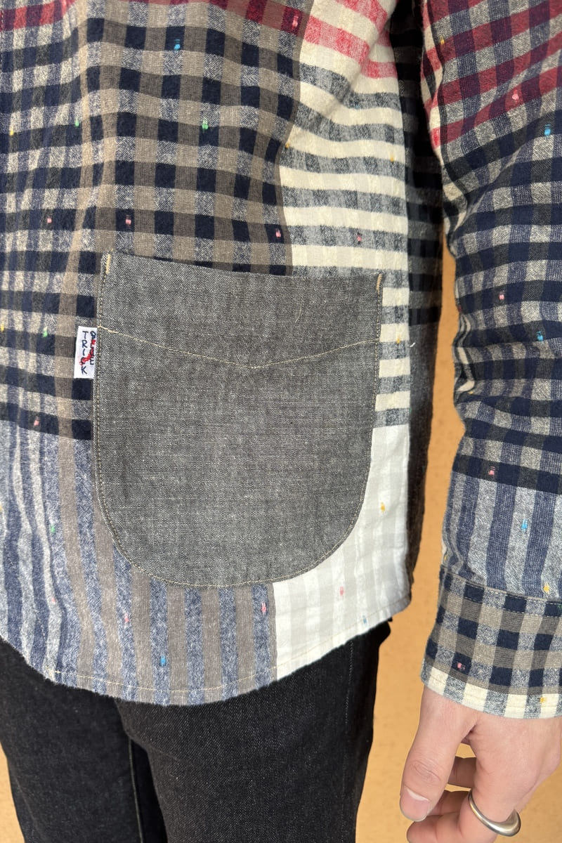 色彩豊かなパネル柄に、繊細なチェックを織り交ぜたBlueTrick オリジナル素材で台襟シャツをお作りしました。