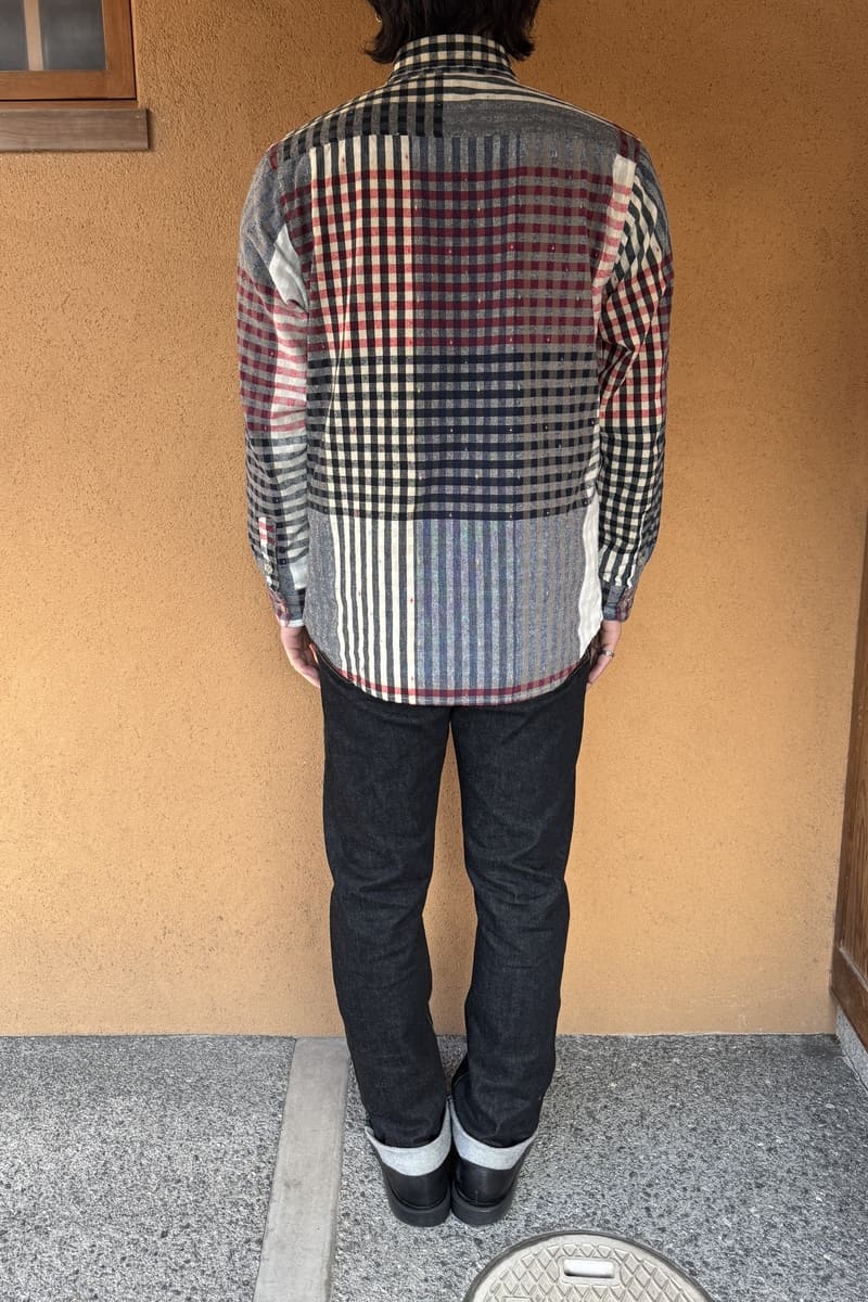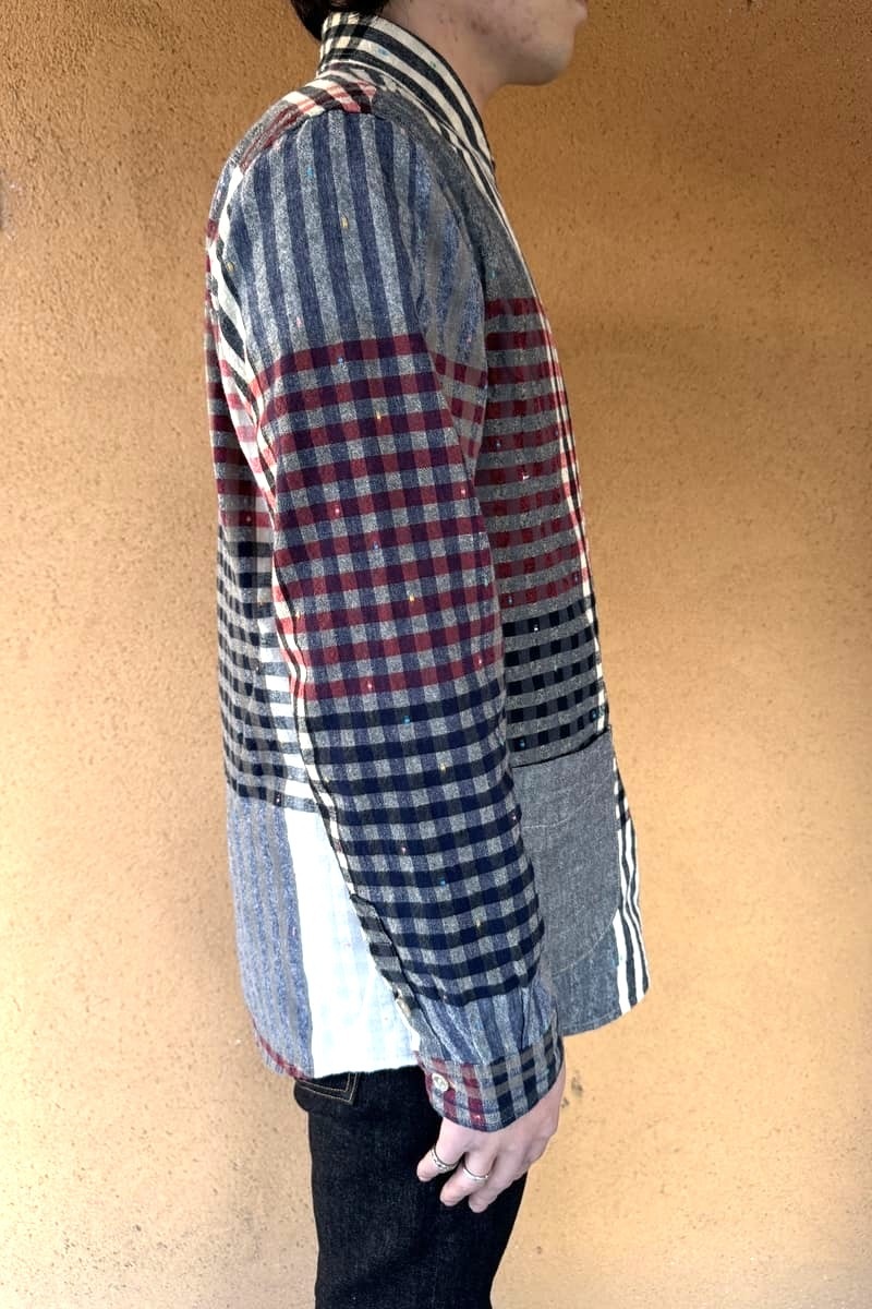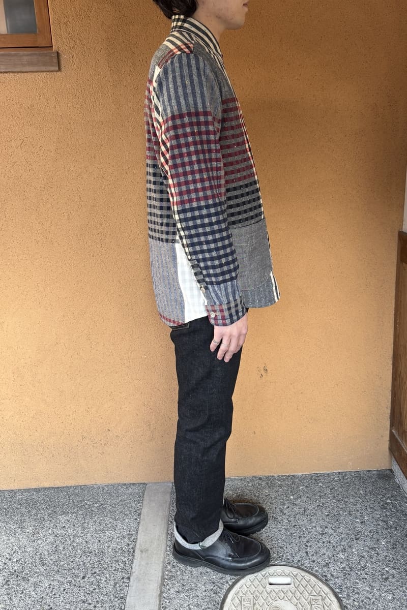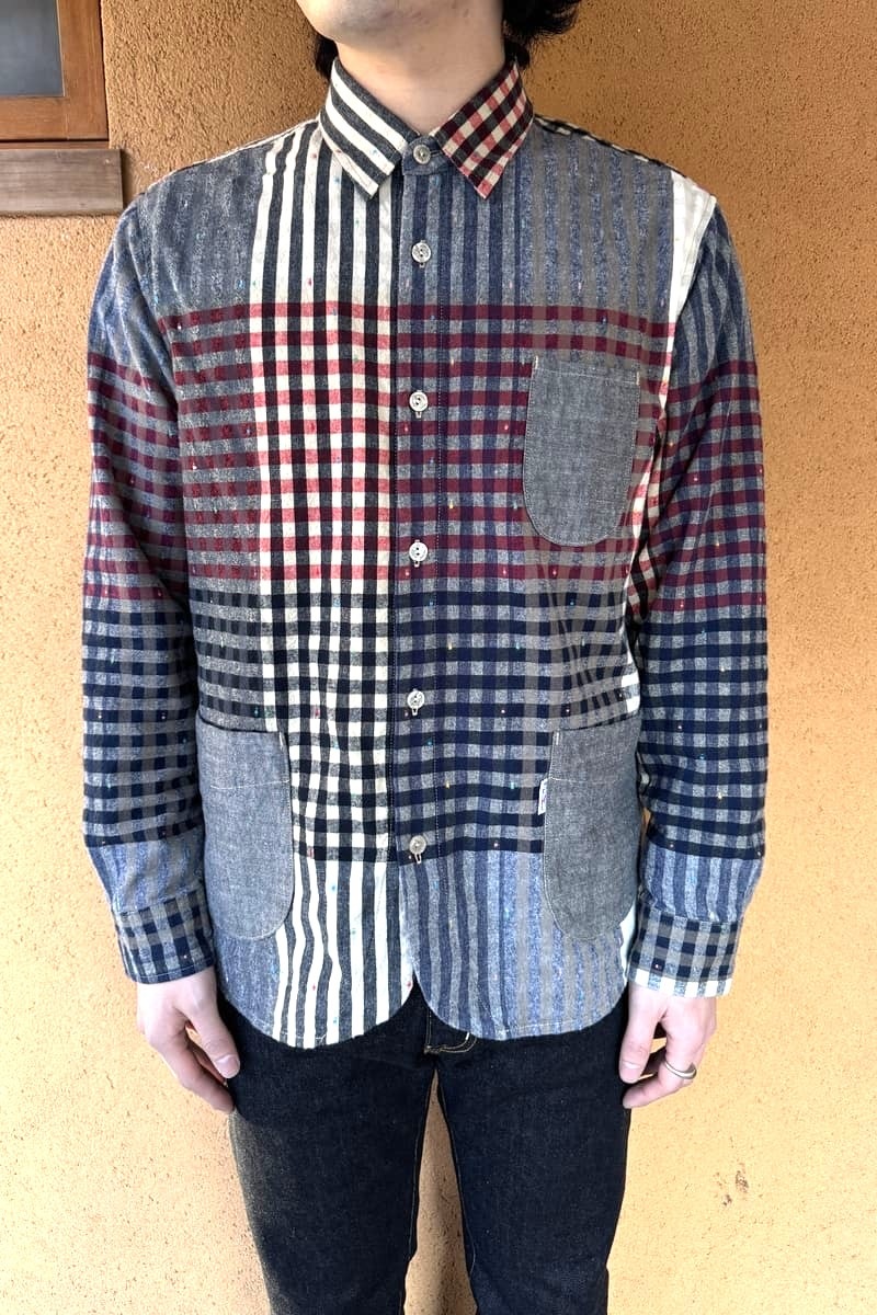 色彩豊かなパネル柄に、繊細なチェックを織り交ぜたBlueTrick オリジナル素材で台襟シャツをお作りしました。