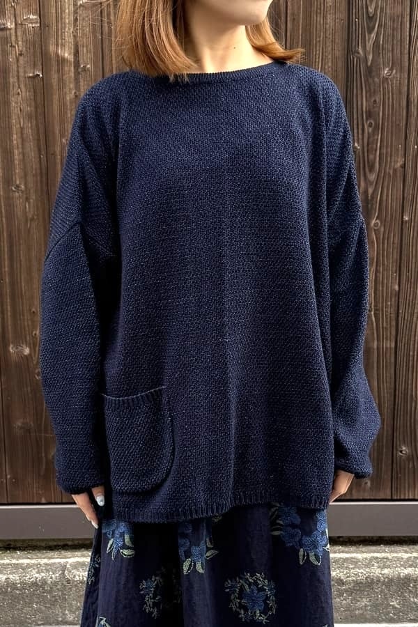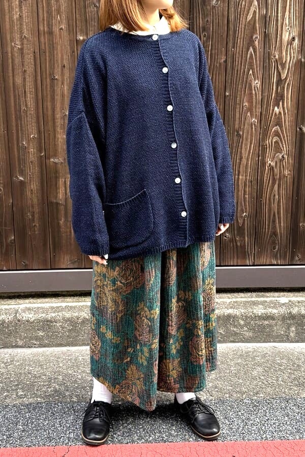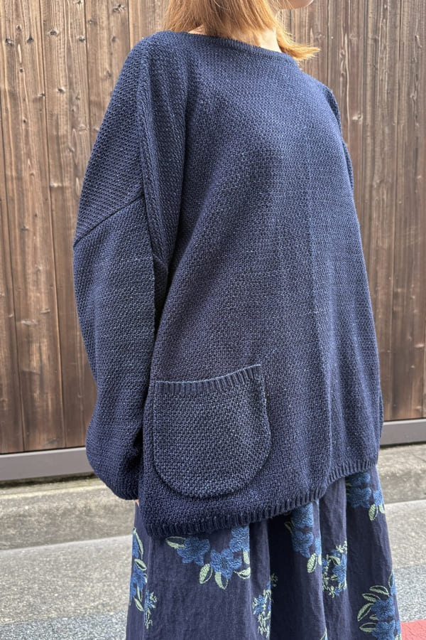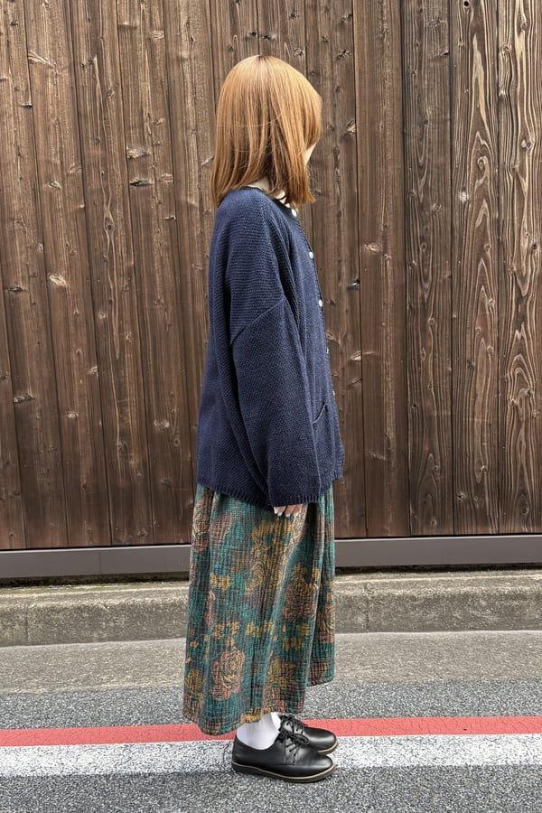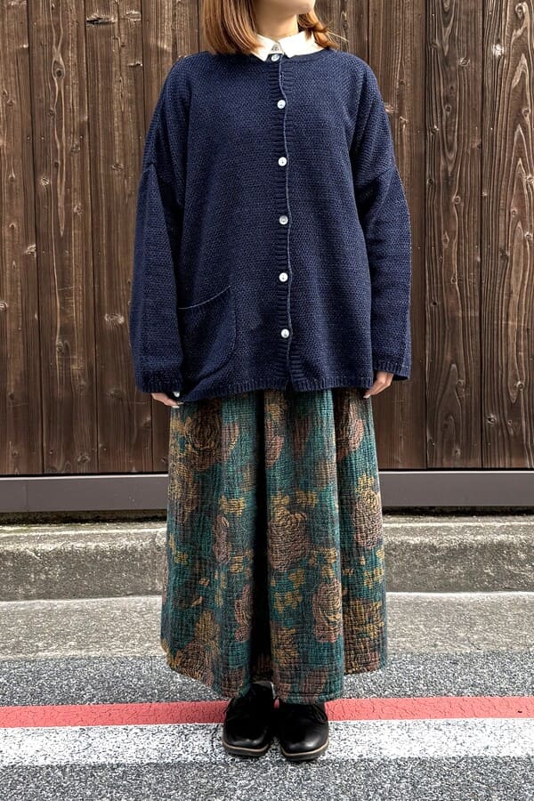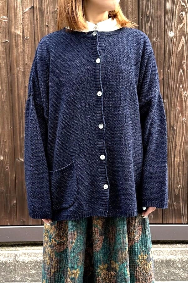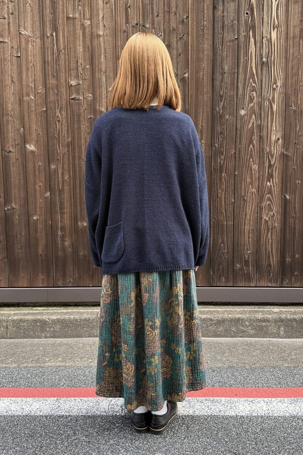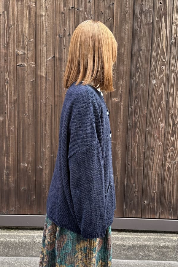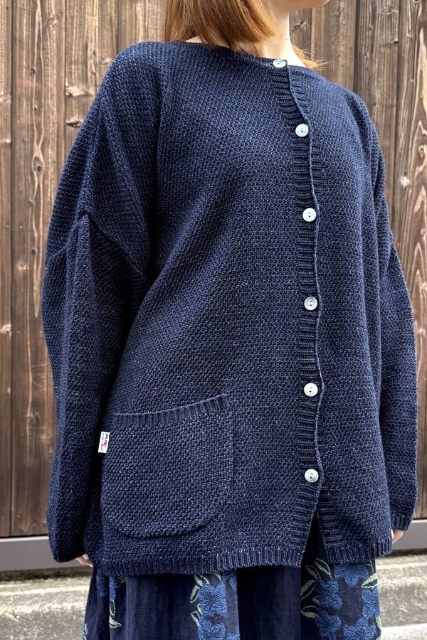 ロープ染色したインディゴ糸を使用して、前後どちらでも着れるニット素材の2wayカーディガンをお作りしました。