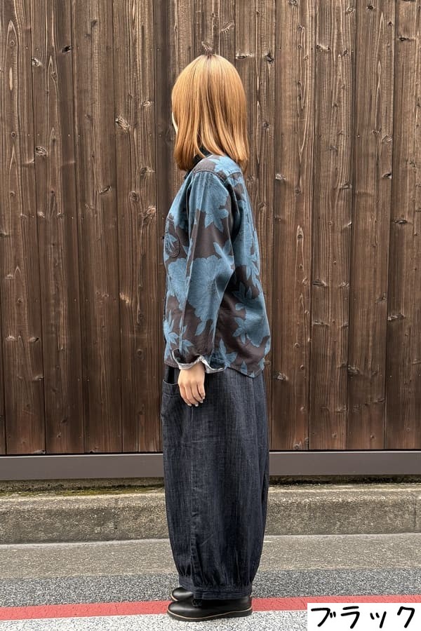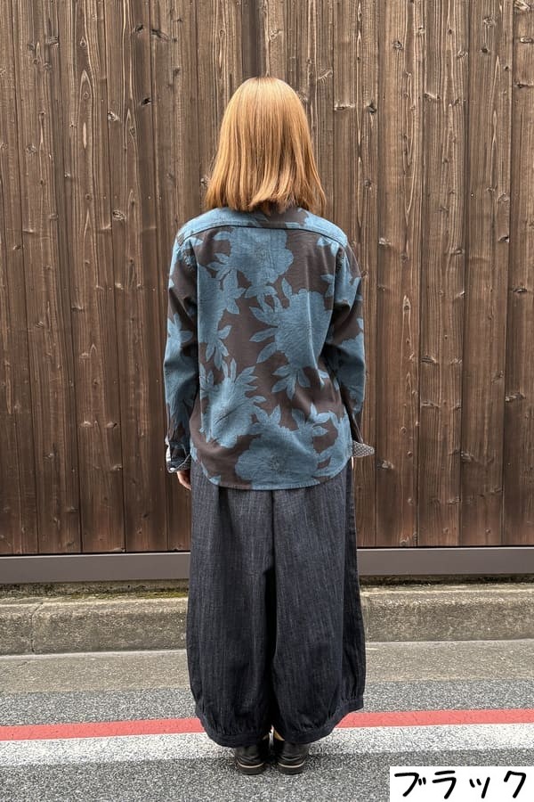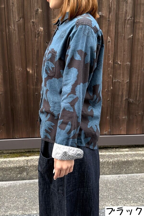 【BlueTrick】裾ラウンドブラウス 花大プリント ブラック/ブルー(レディース)